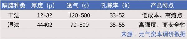 从技术工艺上,干法隔膜与湿法隔膜是现有两种主流产品。干法隔膜技术起步较早,成本低、工艺相对简单,干法成本约为1.3元/平米。而随着高密度电池的需求不断提升,有着更高安全性和更小热收缩性的湿法隔膜市场占比开始提高,湿法隔膜的成本较高,约为1.95元/平米。两者成本相差近60%。