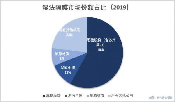 而湿法隔膜的头部效应更甚,2019年恩捷股份收购苏州捷力之后与湖南中锂和星源材质两家公司一同占据了市场77%的销售总量,其中,仅龙头恩捷股份国内市场占有率高达58%。