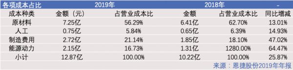 上方图表中我们可以看到,受益于规模效应,原材料和人工虽然在2019年在绝对数量上增长了13.01%和14.93%,但是所占营业成本比却双双下降。与之同时,能源动力的成本也因为生产的扩张急速上升,同比增长64.47%。
