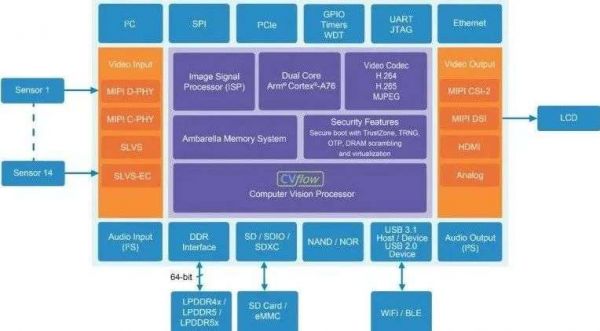 该芯片将Ambarella公司的CVflow AI引擎与双核A76 CPU结合在一起,具有各种人工智能算法所必要的性能。它的高级图像信号处理器(ISP)能以每秒30帧的速度处理8K的图像视频,前台观看和后台处理并行不悖。
