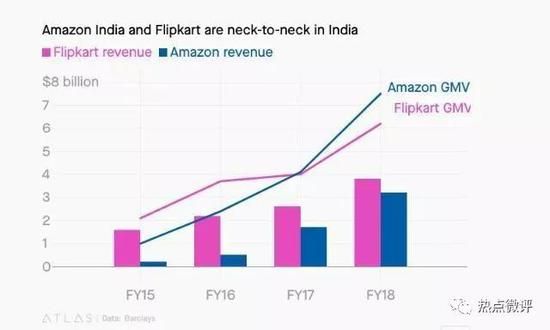 根据英国巴克莱银行的最新报告,截至2018年3月31日, Flipkart 在该财年的营收为38亿美元(不包括子公司 Myntra 和 Jabong),比亚马逊的32亿美元高出19%左右。但亚马逊印度公司的 GMV 比 Flipkart 高出不少。