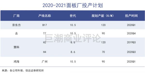 2020-2021年新增的高世代LCD产能,将来自京东方B17的10.5代线、TCL华星光电T7的10.5代线、惠科的2条8.6代线,以及鸿海广州的10.5代线,总计产能扩张约320万平方米/月。此后,面板厂基本不再新增LCD资本开支,供给端将进入稳定期。