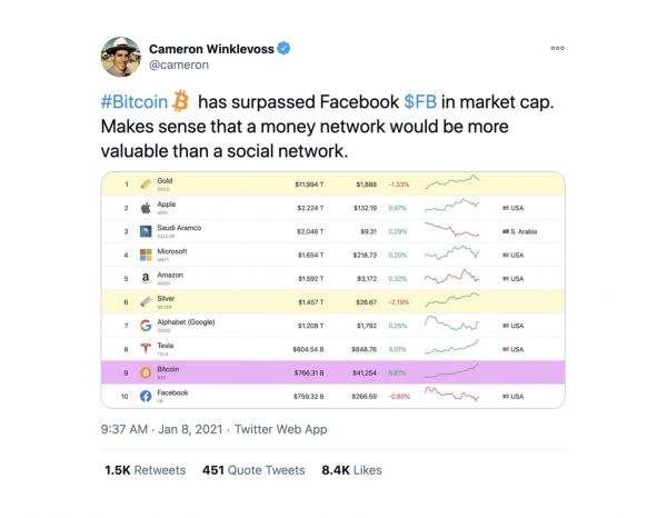 比特币市值已经超过Facebook