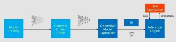 下图展示了OpenVINO(深蓝色)在模型中的作用,它就像假设在深度学习框架(浅蓝色)和用户应用(橙色)之间的桥梁。
