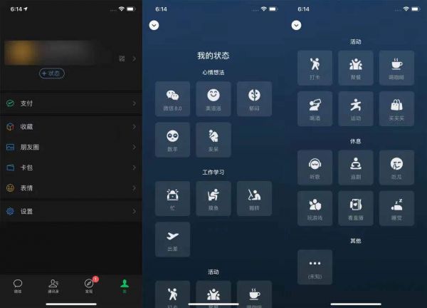 微信8.0的“状态”,让用户可在“我”的页面设定当前状态,同时附带一句签名,可以说点什么,可以带话题、带照片/视频、带位置。用户可以发现同一个状态下的人以及他们的签名,并对其点赞。不同状态下,个人主页会拥有不同的个人背景色。
