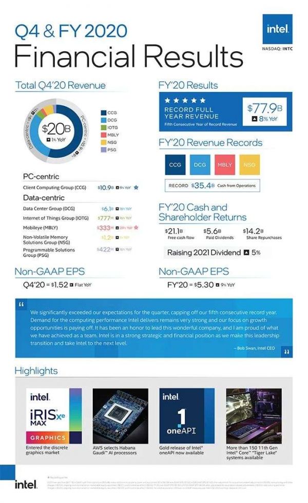 财报中各项业务的表现也非常亮眼,尽管英特尔Q4营收和全年利润与去前年同期都略有下滑,但考虑到去年疫情对业界带来的影响,英特尔能在逆境之中站稳脚步且保证盈利已经是一件值得庆祝的事情。要知道此前华尔街分析师对英特尔Q4的预期营收只有175亿美元,但英特尔却还是给出了199.78亿美元的出色成绩单。