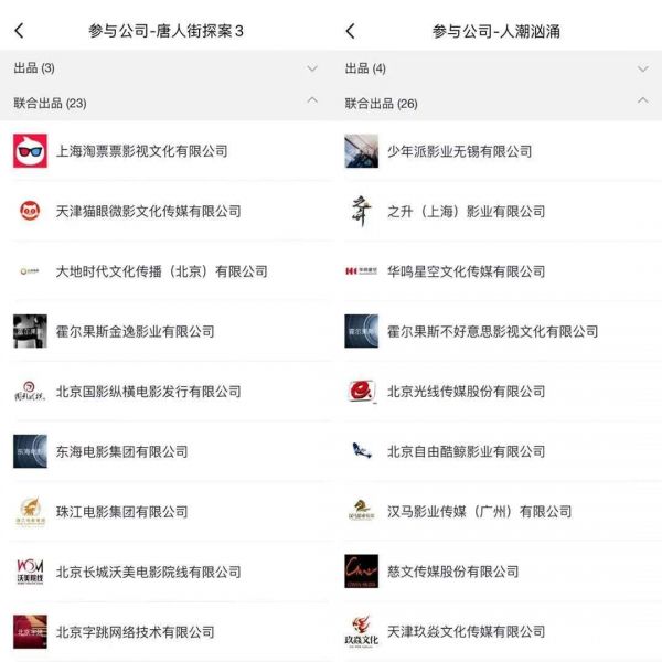 也有影院持相反态度,认为《人潮汹涌》“喜剧+悬疑”类型定位明显与《唐人街探案3》撞型,观众只会二选一。但诡异的是,从猫眼专业版显示的出品方数量上看,《人潮汹涌》比《唐人街探案3》还多出4家,联合出品多达26家。