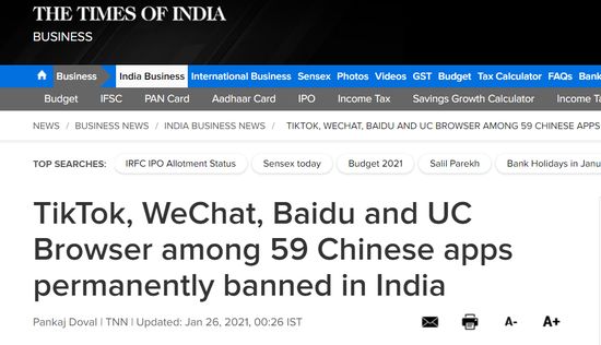《印度时报》在报道中也提到此事称,自去年6月起,印度政府已对267款应用程序(不同批次)采取了“前所未有的”行动。印度电子信息技术部去年6月29日宣布,禁止包括TikTok、微信、微博在内的59款中国应用。7月28日,印度电子信息技术部称印度政府已决定开展第二轮禁用中国网络程序的决定,该禁令涉及47个中国公司开发的程序。同年9月2日,印度电子和信息技术部又发布公告,宣布禁用百度搜索等118款中国手机应用程序。之后的11月24日,印度电子和信息技术部再次发布公告,宣布禁用全球速卖通、钉钉等43款中国背景手机应用程序。