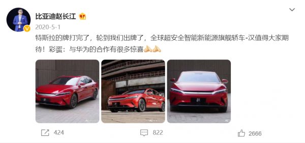 2020年7月份,比亚迪号称“全球超安全智能新能源旗舰轿车”汉系列正式上市。这款车被认为是比亚迪搅局全球高端新能源汽车市场,阻击特斯拉的一张“王牌”。对于这张王牌,比亚迪信心十足。比亚迪汽车销售有限公司总经理赵长江曾公开在微博上向特斯拉下战书。