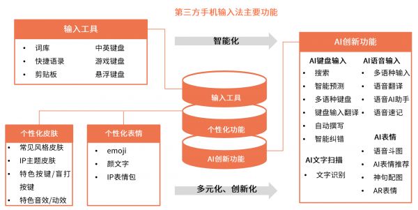 对第三方输入法的功能进行拆分的话,可以细分为三层:最上层是输入工具,包括词库、键盘、剪贴板、快捷语录等功能;中间层是个性化功能,比如不同风格的皮肤、emoji和IP表情包等等;最底层是AI创新功能,涵盖语音输入、智能预测、智能纠错、文字识别、AR等底层技术。