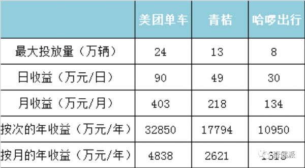 共享单车按次收费收益显著高于包月收费的收益。我们按照亿欧智库提供的共享单车活跃用户日均使用单车2.5次和每次1.5元/30分钟计算,成都美团单车、青桔单车和哈啰出行每年能通过用户骑行获得的收益则分别是3.29亿元、1.78亿元和1.1亿元。
