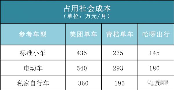 如果以上述三种车型的收费标准计算,可估算出24万辆美团单车在上述三种车型(标准小汽车、电动车、私家自行车)的收费标准下占用的社会成本分别为435万元/月、540 万元/月、360万元/月;13万辆青桔单车则为235万元/月、293万元/月、195万元/月;8万辆青桔单车则为145万元/月、180万元/月、120万元/月。