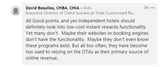 收益管理公司TCRM的高管David Beaulieu也认为,单体酒店应该考虑以低成本的方式奖励忠诚旅客。但是很多单体酒店并没有采取行动。
