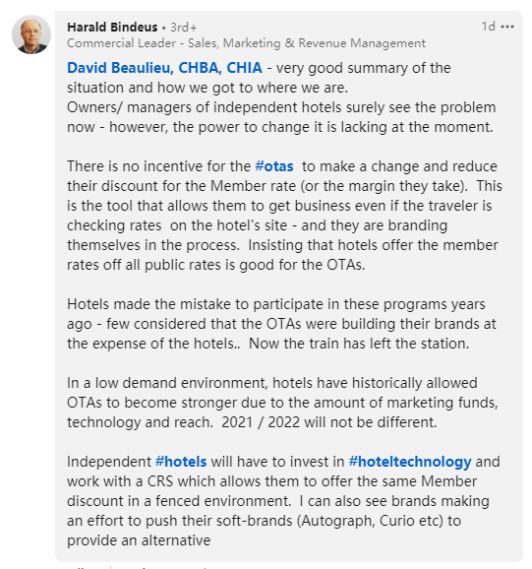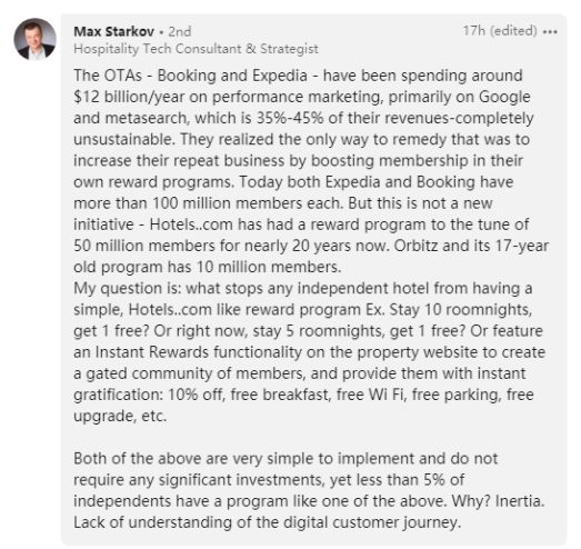 “也许他们的网站不具备这个功能,也有可能他们根本不知道这些会员计划的存在。但最重要的原因是,他们过于依赖OTA。”