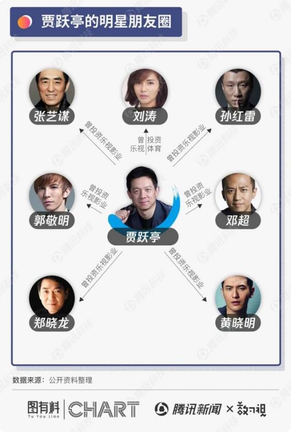 最给贾跃亭带来流量的朋友圈,是来自国内的明星,如张艺谋、郭敬明、郑晓龙、郭敬明、孙红雷、邓超、黄晓明等人,这些明星大多都参与到贾跃亭当年旗下的乐视影业项目。