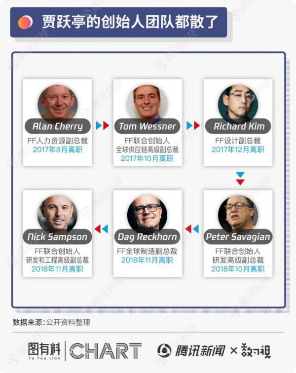 贾跃创立FF之初,组建了五名外籍高管团队,包括Nick Sampson, Alan Cherry, Tom Wessner, Richard Kim以及Dag Reckhorn。