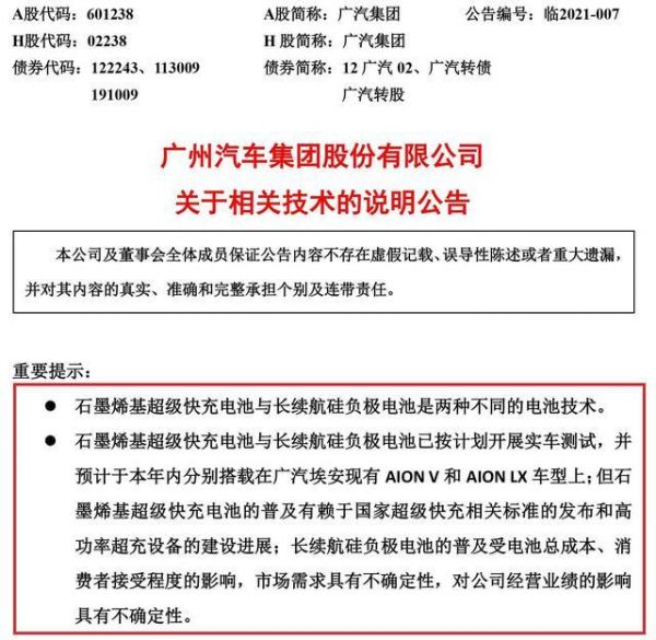 针对院士的质疑,广汽很快发表了说明公告并表示:“石墨烯超级快充电池”和“长续航硅负极电池”是两种电池。