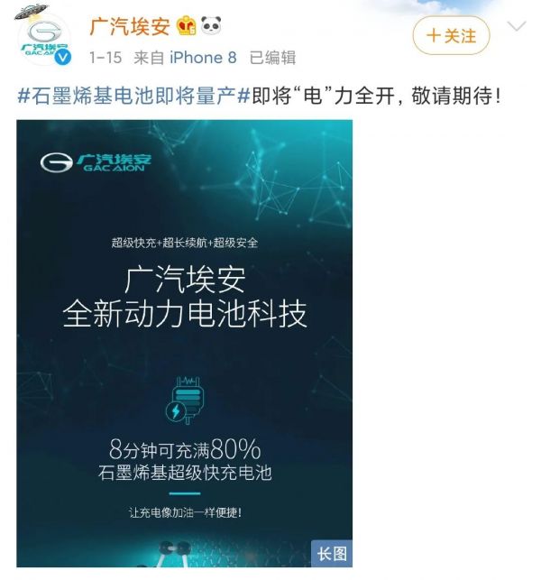 1月15日,广汽埃安官方宣布,公司旗下石墨烯电池已进入实车量产测试阶段,8分钟内实现充电80%,续航里程可达1000公里。