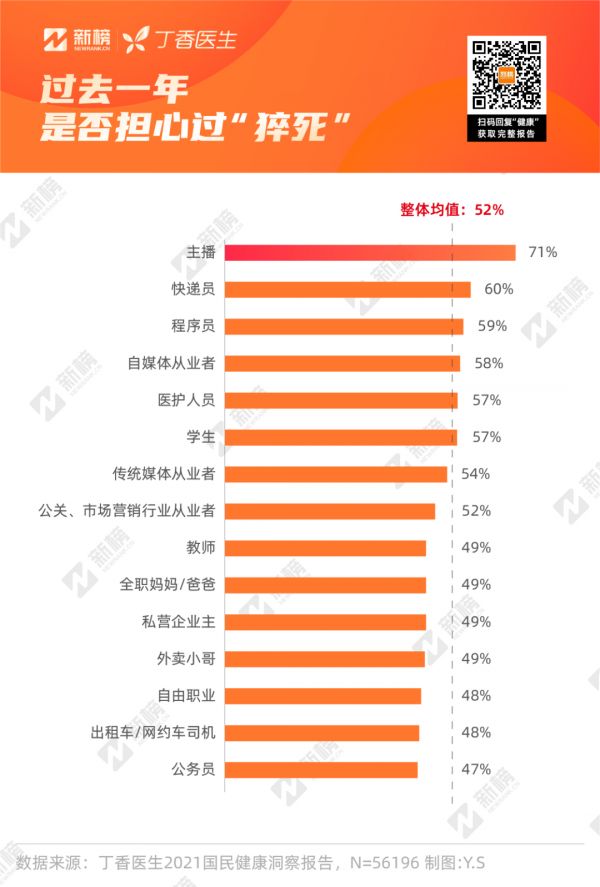 数据显示,58%自媒体从业者担心自己猝死,仅次于主播、快递员、程序员,整体排名第四。值得一提的是, 71%主播担心自己猝死,远高于其他职业,他们或许在承受着“8小时里看不见的压力”。
