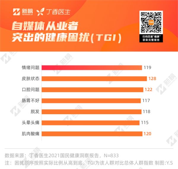据《报告》显示,对比总体人群来看,自媒体从业者最为突出健康困扰是皮肤状态不好、口腔问题和肌肉酸痛,而情绪问题、脱发、肠胃不好、头晕头痛同样困扰着自媒体从业者。