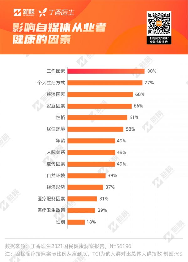 据《报告》显示,自媒体从业者认为影响自己整体健康首要因素是工作,甚至大于个人生活方式带来的影响。