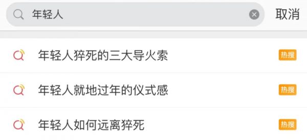 打开微博输入“年轻人”,自动跳出的前三个热搜话题中有两个就是关于“年轻人猝死”