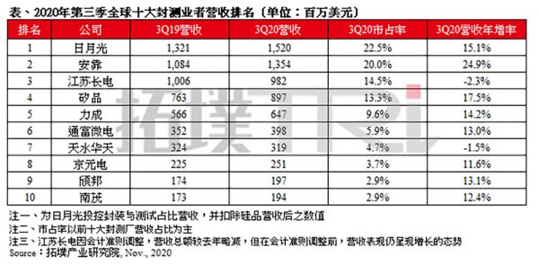 根据拓墣产业研究院2020年第三季度全球十大封测业营收排名,位于中国大陆的江苏长电、通富微电、天水华天分别位列全球第3、第6、第7。