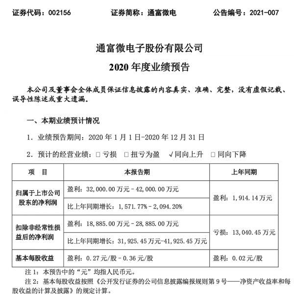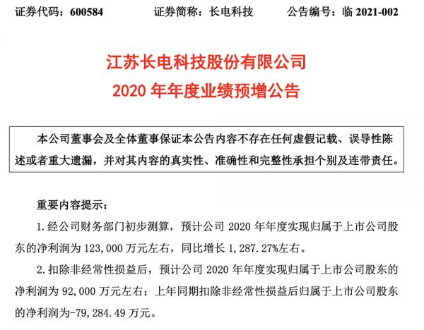 此前江苏长电也在1月23日发布业绩预告,预计2020年净利润将达到12.3亿元。