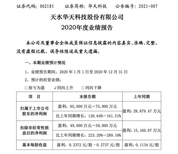 扣除非经常性损益后,华天科技2020年年度实现归属于上市公司股东的净利润预计为49000-59000万元,比上年同期(15160.87万元)增长223.20%-289.16%。