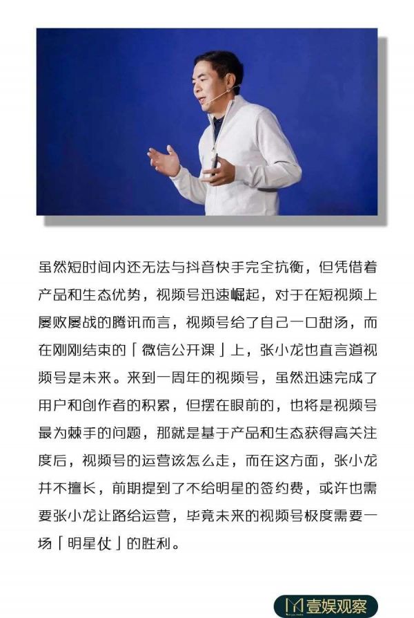 张小龙让内容平台的产品落地了,但是,在这个短视频内容满天飞的时代,内容运营才能决胜平台的未来,走到现在,拥有一定话语权和流量积累的视频号该把运营逻辑前置了,如何引流娱乐明星或者更头部、更优质的创作者入场,并且留下来,扩大视频号的内容势能,需要运营者迅速反应了,而在运营这件事上,张小龙也必须“让路”了。