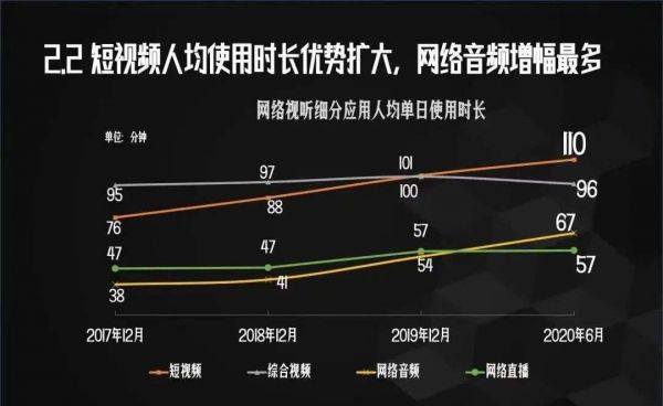 《2020中国网络视听发展研究报告》显示,我国网络视听用户规模达9.01亿,2019年网络视听产业规模达4541.3亿。最关键一点,短视频人均单日使用时长110分钟。另据QuestMobile数据,微信用户时长为85.8分钟。