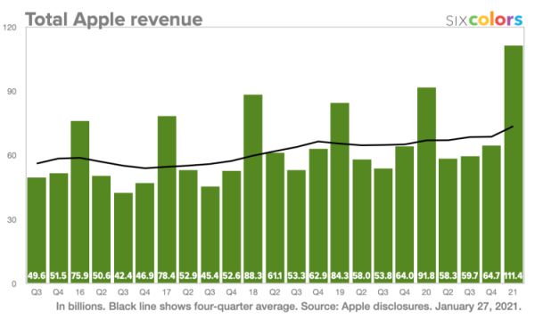 北京时间 1 月 28 日凌晨,苹果公布了 2021 财年第一季度(10 月到 12 月)财报。按照传统,这一季度包含了美国的传统假日购物节(圣诞节),是苹果每年营收最大的季度,1114.39 亿美元的总营收是苹果有史以来最高的季度收入。