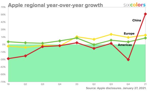 另一重要原因,在 2021 年第一财季当中,不仅包含了美国的传统假日大促,更有中国的双十一和双十二购物节。iPhone 12 系列与 M1 芯片产品为中国市场的销量提供了不小贡献,iPhone 12 系列首销时期,甚至出现了苹果锁定渠道商,控制促销价格的情况。