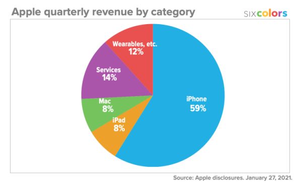苹果的确在为此努力,新款 iPad 和 M1 芯片 Mac 推出使得这些品类有明显的提升。并且由于全球疫情影响,居家办公和学习成为普遍现象,一定程度上推动了 iPad 与 Mac 的销售。iPad 与 Mac 分别增长了 41% 和 21%,均占据整体营收的 8%。