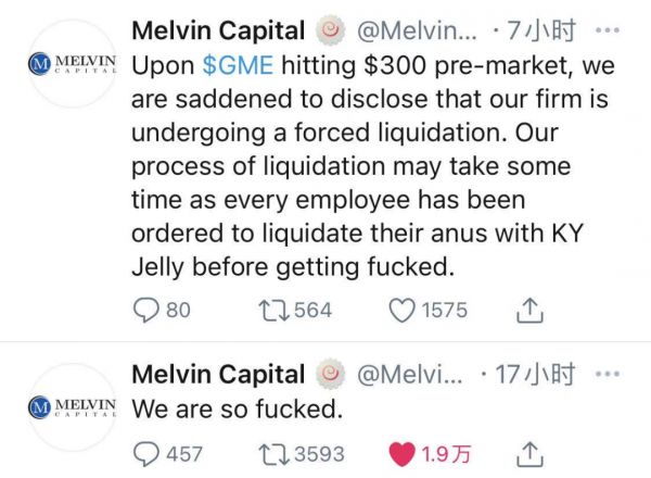 华尔街上有人暗暗窃喜,有的愁云惨淡。随着GME(游戏驿站)股价盘前暴涨100%,超过300美金时,推特上一片沸腾。百亿美金级对冲基金Melvin Capital(梅尔文)很快“投子认负”,宣布平仓,原因是做空了这只股票。而它的对手无比神秘,被很多媒体称为“散户”。
