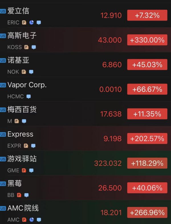 有一点可以明确,这次媒体们话术中的“散户收割华尔街伟大战役”中,混进了散户之外的人。于是,以攻打GME为由头,多头部队在1月27日四处开花“做空概念股”,AMC院线盘前涨幅高达400%,Express盘中涨至300%......整个美股乱成了一锅粥,有投资者戏称为“道琼斯格勒战役”。