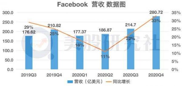 2020年Q4财报显示,Facebook营收为280.72亿美元,同比增长33%。其中,核心业务广告的营收为271.87亿美元,同比增长31%。