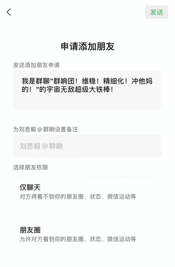 微信,强制要求每一个用户在添加别人为好友,以及在被动通过别人的添加申请的时候,必须要做选择: