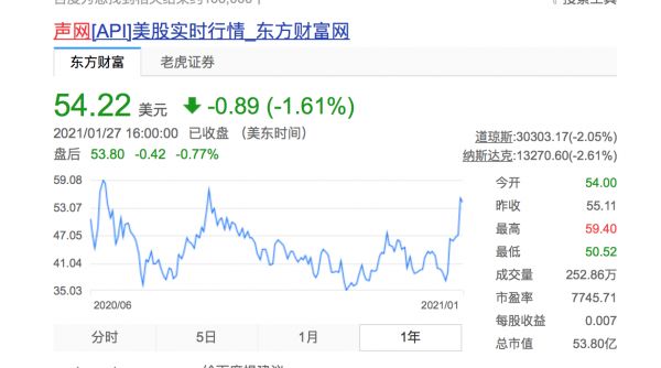 2020年6月26日上市当日,声网的市值是50.6亿美元,截至发稿日2021难1月28日,这一数字变成了53.8,半年时间仅仅增长了三亿美元。