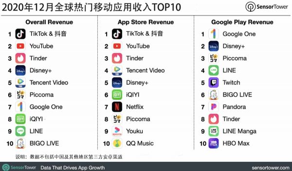 此前SensorTower的数据显示,在12月全球热门移动应用收入Top10中,抖音&TikTok再次蝉联冠军。2020年12月抖音及海外版TikTok在全球App Store和Google Play吸金近1.42亿美元,是去年12月的3.3倍。