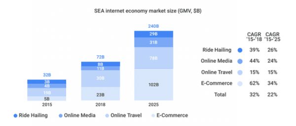 第1, 在东南亚互联网企业发展初期这是没有"独角兽"的,还不存在马太效应,这儿还是个待开发的市场,据谷歌发布的《2018东南亚互联网经济报告》预测2025年将超预期达到2400亿美元,占东南亚GDP的8%。如中国互联网发展初期一般,在占领一个高地之后,可以迅速地将触手伸向其他高地,以此形成"超级应用",比如中国的微信、支付宝、美团。