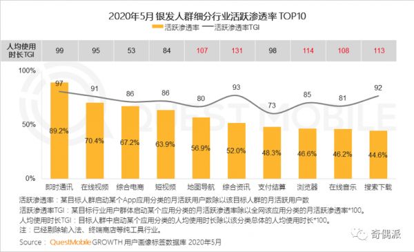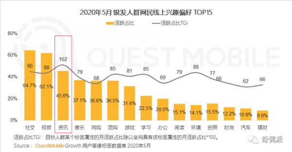 QuestMobile数据也显示,进入人生的下半场,由于时间较为充裕,银发人群对于娱乐、资讯类、生活服务类需求突出。