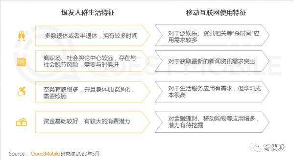 有数据显示,当年中国的网络用户中,老年网民超1亿,用户增速14.4%。可以说,老年网民的增速远远超过移动互联网网民的整体增速。选择收割,是看中了现有老年网民的特点;选择布局,是看到了银发经济的未来。