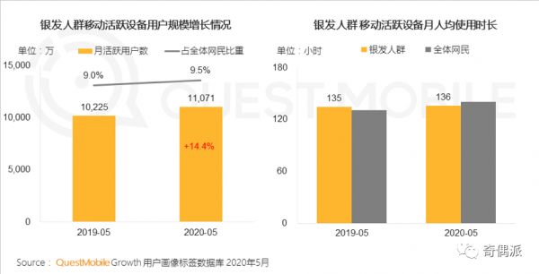 QuestMobile数据显示,银发人群移动活跃设备用户规模超过1亿,增速远高于全网,已经成为移动网民重要增量来源。