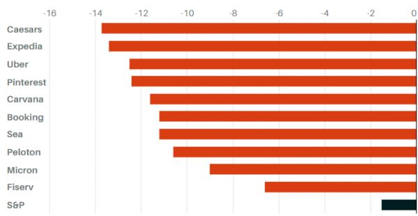 最受对冲基金欢迎的10只股票过去五个交易日的跌幅