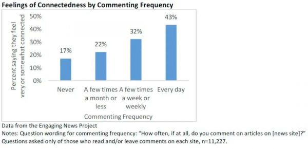 研究者还发现,只有26%的被调查者认为自己能和评论区的其他用户产生联结感(feelingsof connectedness)。这种联结感和发表评论的频率正相关,在从不发表评论的被调查者中,只有17%的人能感受到联结感;而在每天发表评论的被调查者中,有43%的人能感受到。