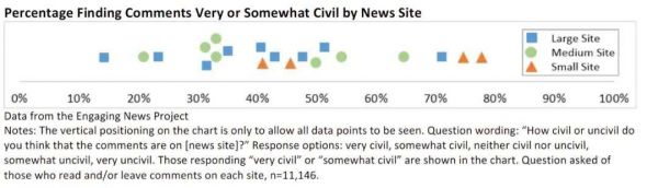 新闻媒体机构的规模和评论区文明程度的关系。图片来源:德克萨斯州大学奥斯汀分校媒介参与研究中心