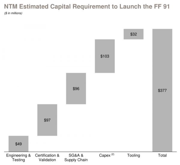 FF还详细列出了首款电动车从完成融资到实现上市销售过程中所需要投入的资金总量,大约为3.77亿美元,其中工程和测试需4900万、核检9700万、供应链和管理费用9600万、资本投入1.03亿。