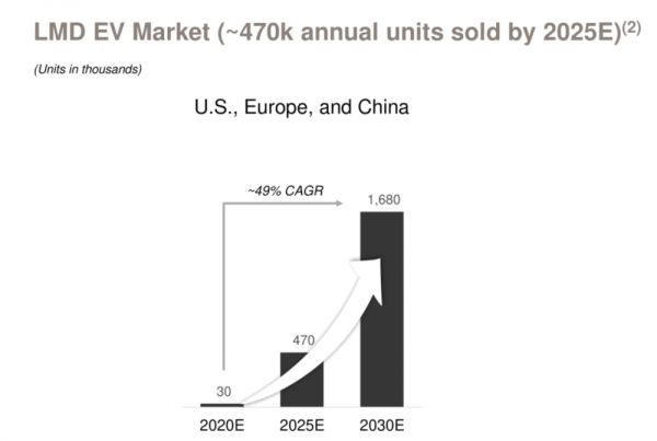 FF未来业务重点为电动乘用车和“最后一英里”货运,根据彭博的研究数据显示,未来电动乘用车从2020年至2030年的未来10年间,美国、欧洲和中国的复合年增长率分别为34%、29%和30%。“最后一英里”货运市场,美国、欧洲和中国合并复合年增长为49%。