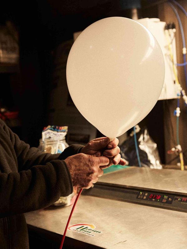 迈克·斯特里斯基在他家中的实验室里,用氢气充满一个气球|图片来自《纽约时报》|摄影Kat Slootsky